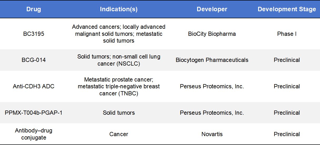 Additional CDH3-targeted ADC programs are being pursued by Perseus Proteomics and Novartis, although these remain at preclinical stages.