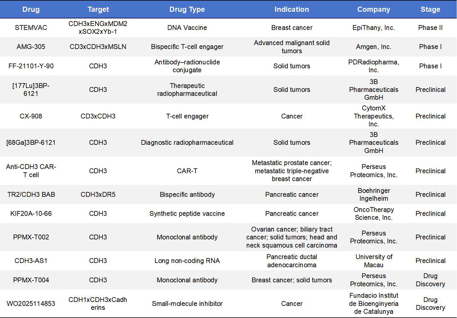 At present, CDH3-targeted therapies are steadily advancing into clinical development. According to incomplete statistics, approximately 26 CDH3-targeting agents are under development globally, including four in clinical trials and twelve in preclinical stages, with ADC-based modalities predominating among active programs.