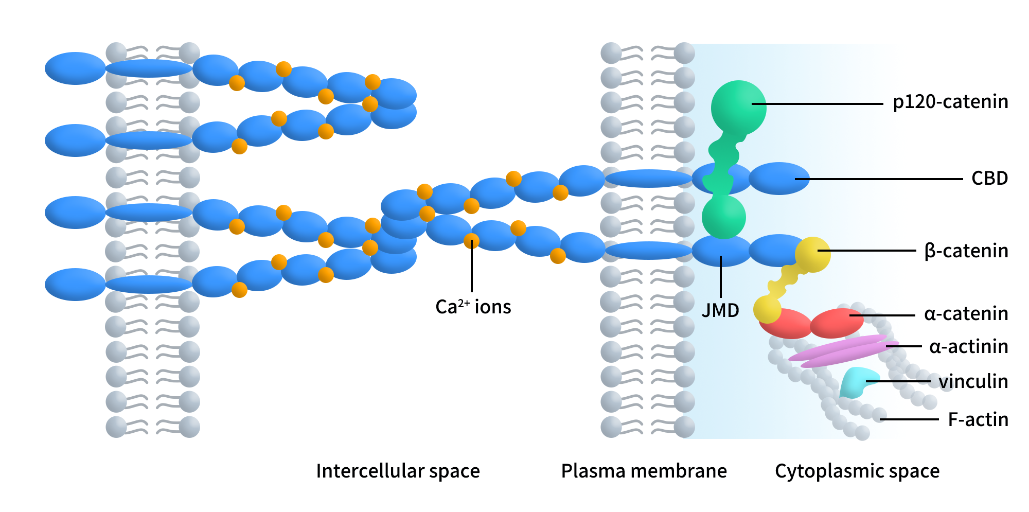 The cytoplasmic domain contains two functionally critical regions: the juxtamembrane domain (JMD) and the catenin-binding domain (CBD). The JMD plays a key role in regulating cell migration, whereas the CBD is essential for cadherin function. Known interacting partners include α-, β-, γ-, and p120-catenins. β-catenin and γ-catenin are signaling molecules involved in tissue patterning, whose activity is regulated by CBD integrity, tyrosine phosphorylation, and transcriptional control. p120-catenin directly binds the JMD, modulating cadherin trafficking, stability, adhesive strength, and cell motility in a tyrosine kinase–dependent manner. α-catenin links the cadherin–catenin complex to the actin cytoskeleton and participates in signal transduction, providing the structural basis for CDH3 functioning as both a structural adhesion molecule and a signaling regulator [1].