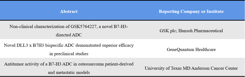 B7-H3 continues to be one of the most promising next-generation ADC targets. Its broad expression across solid tumors makes it highly suitable for ADC development. The field has moved beyond initial validation into bispecific strategies, indication stratification, and mechanism optimization, reflecting increasing competition and maturity. Representative abstracts include: