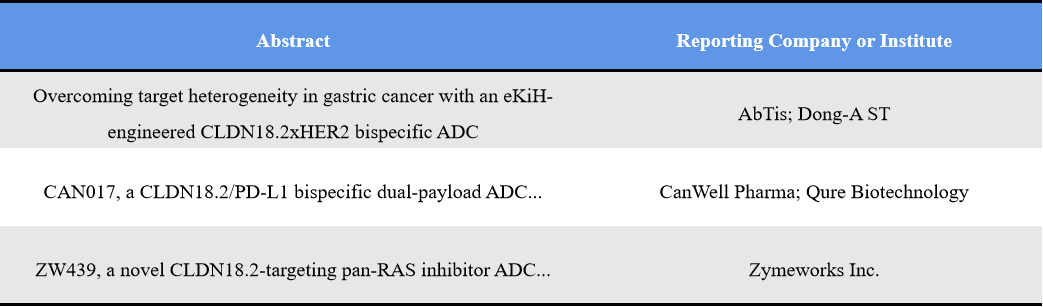 Meanwhile, CLDN18.2 is expanding from monoclonal antibodies and bispecifics into ADC formats, particularly in gastrointestinal cancers. Both targets highlight diversification of ADC strategies across tumor types and mechanisms.Representative abstracts include: