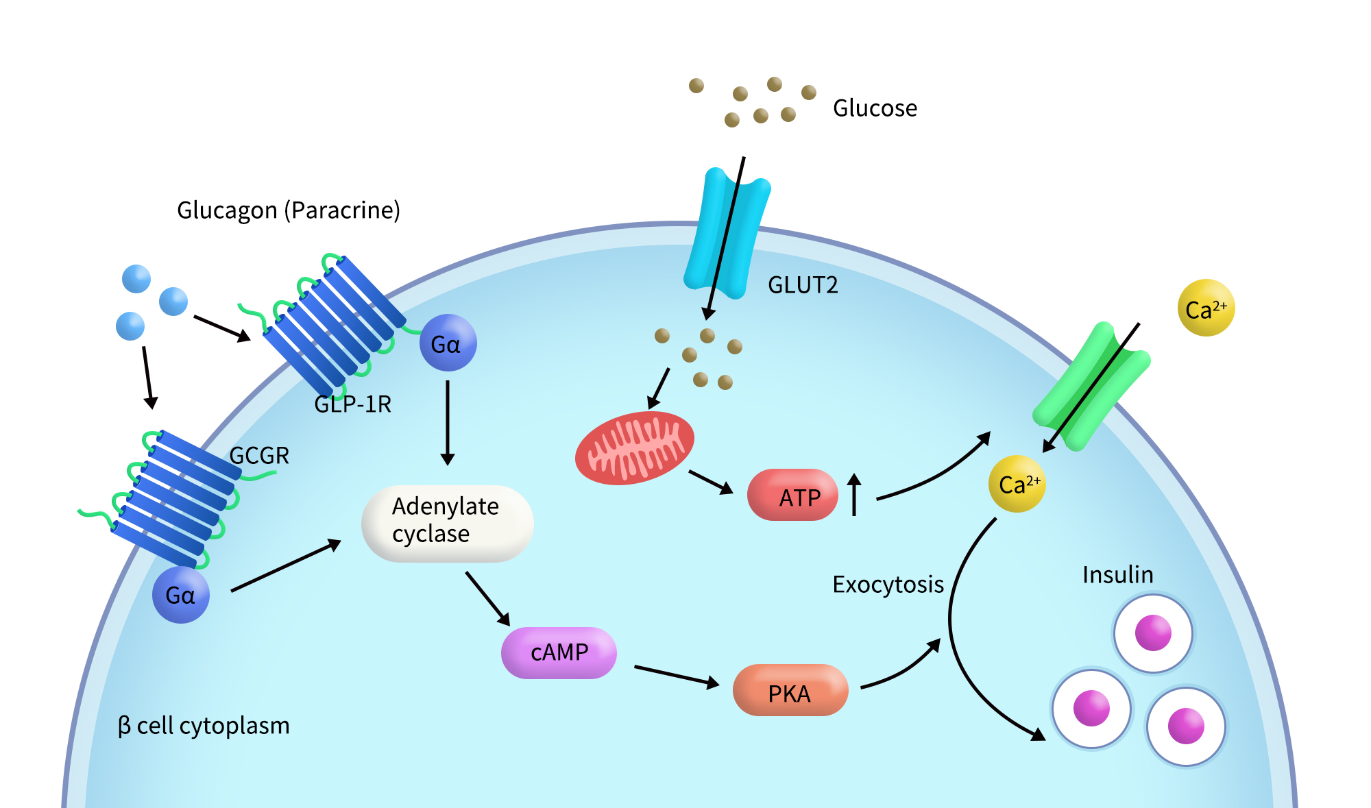 GCGR plays a critical role in glucose metabolism and glucose homeostasis. When glucagon binds specifically to GCGR, it promotes glycogen breakdown in the liver, increasing blood glucose levels and stimulating insulin release. Studies indicate that under normal physiological glucose concentrations, GCGR can enhance insulin secretion in response to glucagon [4]. As a member of the class B GPCR family, GCGR is involved in various physiological processes and is a valuable drug target for a range of diseases, including diabetes, metabolic syndrome, osteoporosis, migraine,depression, and anxiety[2], with a particularly important role in the treatment of type 2 diabetes. Glucagon binds to GCGR on pancreatic β-cells, and the activated receptor then binds to the G protein Gα, leading to the activation of adenylate cyclase (AC) and the formation of cAMP, which results in increased blood glucose levels[5].
