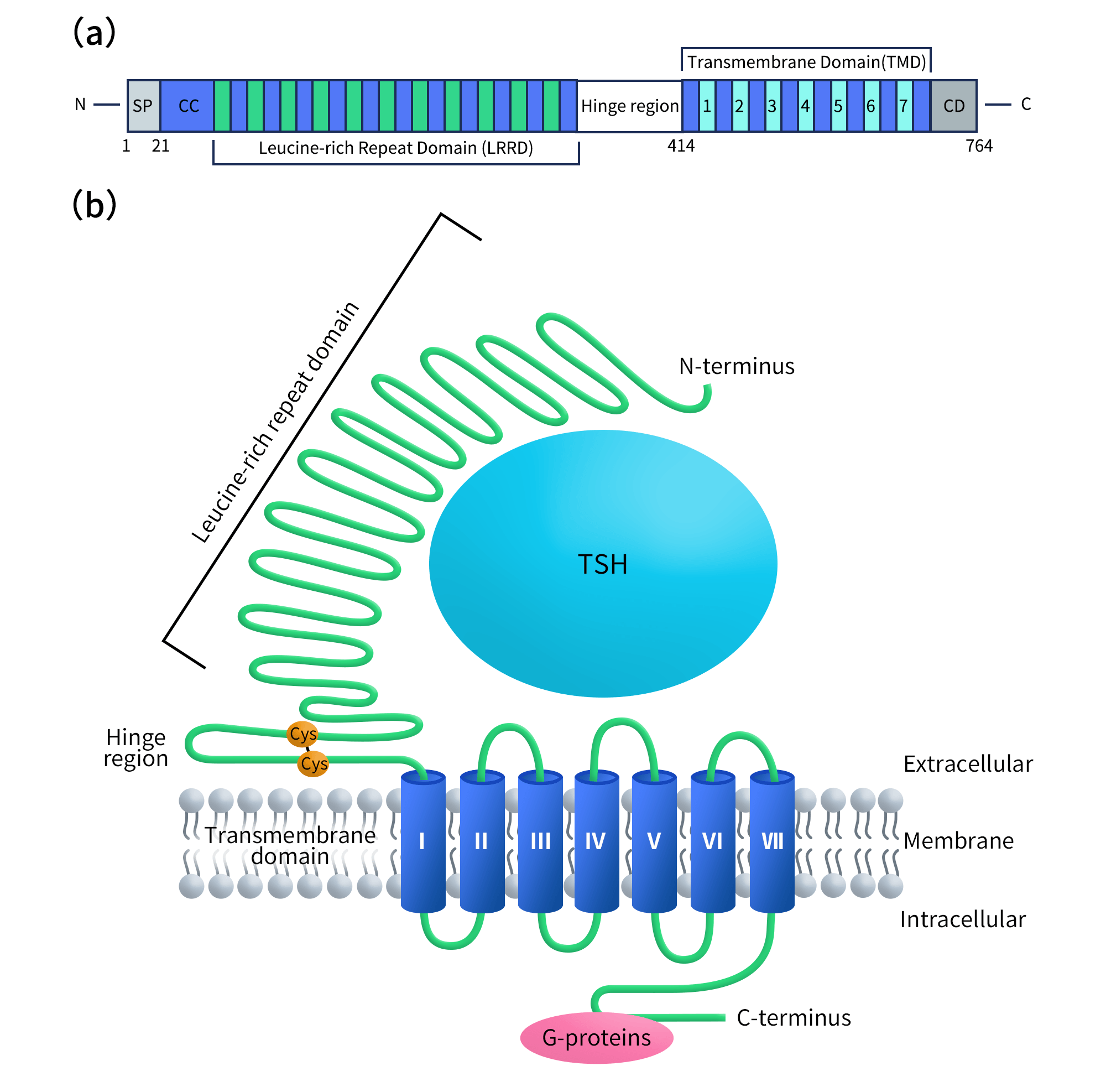 Figure 1. (a) Domain organization of the full-length TSHR protein. (b) The topology model of TSHR.