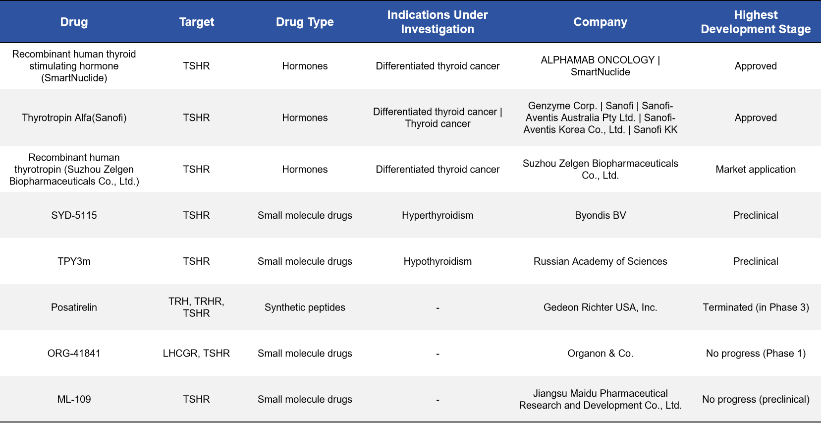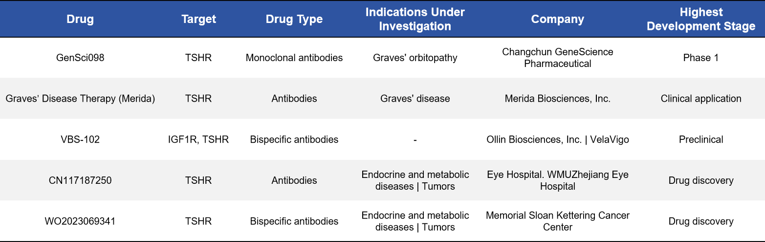 At present, two TSHR agonists have been approved, primarily for use in the diagnosis and adjuvant management of differentiated thyroid cancer. Beyond these, multiple candidates are under clinical investigation, spanning Phase I to Phase II development. Graves’ disease and thyroid eye disease (TED) represent the most intensively pursued indications. Notably, with advances in platform technologies, TSHR is now being explored in CAR-T cell therapy, LYTAC-based degraders, bispecific antibodies, and molecular imaging probes. These novel approaches are largely directed toward complex or refractory conditions—such as treatment-resistant thyroid cancer and severe ophthalmopathy—highlighting the expanding therapeutic potential of the TSHR target.The major drug classes and representative developments are summarized below.