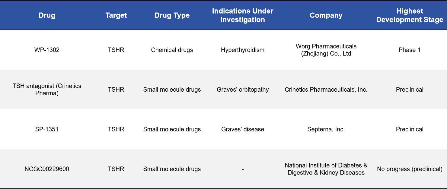 Several candidates have entered clinical or preclinical development, including WP-1302 (Worg Pharmaceuticals, Phase I), SP-1351 (Septerna, preclinical), and a TSHR antagonist developed by Crinetics (preclinical). These compounds have the potential to offer Graves’ disease patients more precise, mechanism-based alternatives to conventional antithyroid therapies.