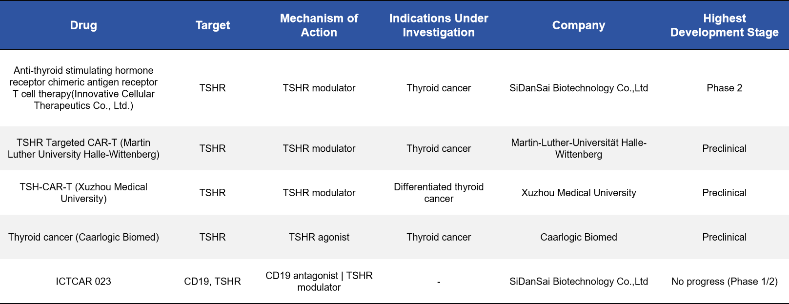 TSHR is highly expressed on certain thyroid tumor cells, making it an attractive target for CAR-T cell therapy. Several TSHR-directed CAR-T programs have progressed into clinical or preclinical development. Among them, anti-TSHR CAR-T therapy developed by SiDanSai Biotechnology has advanced to Phase II clinical trials, representing the most advanced TSHR-based cell therapy program to date.