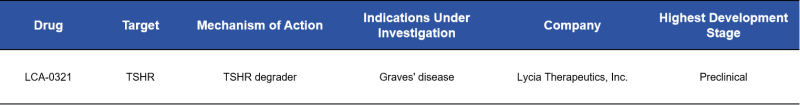 LYTAC (lysosome-targeting chimera) technology is an emerging drug design strategy that enables direct degradation of cell-surface target proteins, rather than merely inhibiting their function. LCA-0321 (Lycia Therapeutics) is among the few publicly disclosed TSHR degraders and is being explored for the treatment of diseases characterized by excessive receptor activity, such as Graves’ disease.