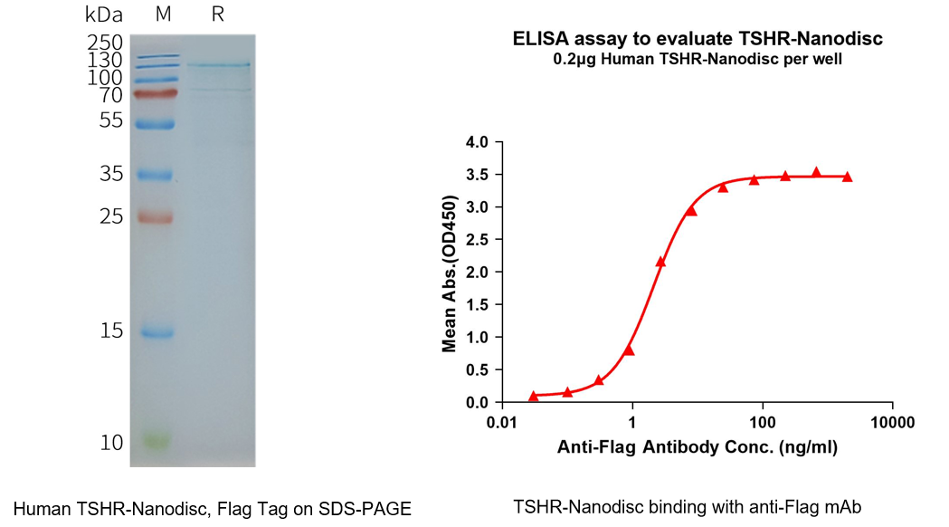 Accordingly, full-length TSHR membrane proteins presented in a native-like lipid environment, such as nanodiscs, have become indispensable experimental tools for receptor pharmacology, antibody recognition, and molecular screening. Leveraging its established Nanodisc membrane protein platform, DIMA BIOTECH has successfully produced full-length TSHR proteins with intact transmembrane domains and native conformational integrity.