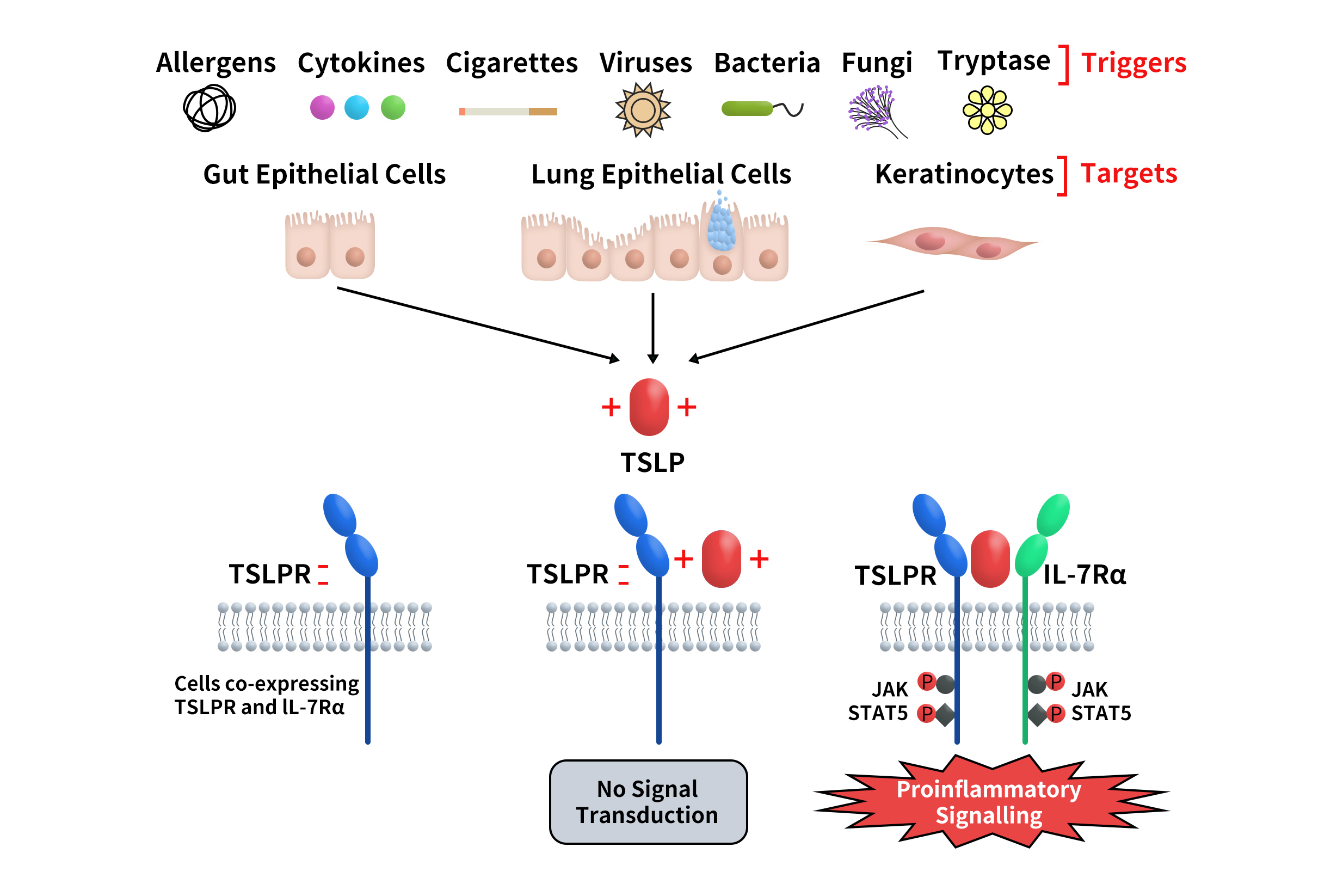 TSLP is implicated in a variety of diseases, particularly playing a central role in allergic and inflammatory disorders such as asthma, atopic dermatitis, allergic rhinitis, and inflammatory bowel disease. Moreover, recent studies have revealed that TSLP also contributes to tumor immune evasion and autoimmune diseases, making it an attractive therapeutic target with broad potential applications. [1]