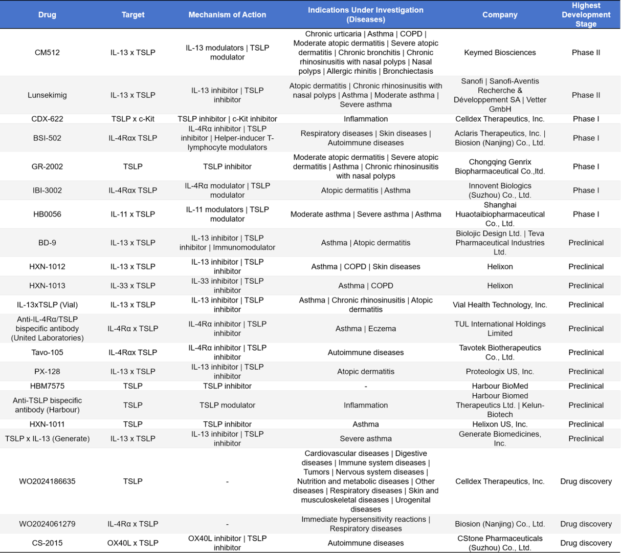 In TSLP-targeted drug development, bispecific antibodies have attracted significant attention. CM512 (Keymed Biosciences ) and Lunsekimig (Sanofi) have entered Phase II clinical trials, primarily targeting asthma and atopic dermatitis. The Phase I pipeline includes diverse designs such as TSLP × c-Kit, IL-4Rα × TSLP, and IL-11 × TSLP, covering indications in respiratory, inflammatory, and autoimmune diseases. At the preclinical stage, development is even more active, with multiple companies advancing bispecific combinations of TSLP with IL-13, IL-33, IL-4Rα, and others. Overall, the TSLP bispecific antibody pipeline demonstrates diverse design strategies and broad therapeutic potential.