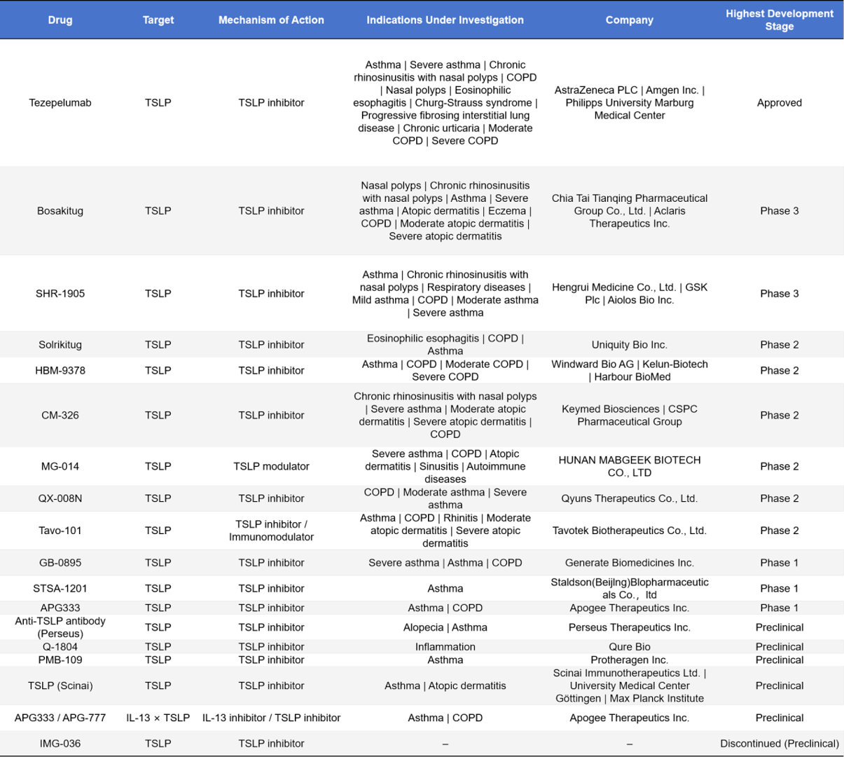 In the field of TSLP-targeted therapeutics, Tezepelumab has already been approved for the treatment of multiple allergic diseases, including asthma, nasal polyps, and eosinophilic esophagitis. Representative Phase III candidates include Bosakitug and SHR-1905, which mainly target asthma, COPD, and atopic dermatitis. The Phase II clinical pipeline is relatively diverse, with agents such as Solrikitug, HBM-9378, CM-326, MG-014, QX-008N, and Tavo-101, covering indications in respiratory and dermatological diseases. Phase I drugs, represented by GB-0895, STSA-1201, and APG333, are still under evaluation for safety and efficacy.