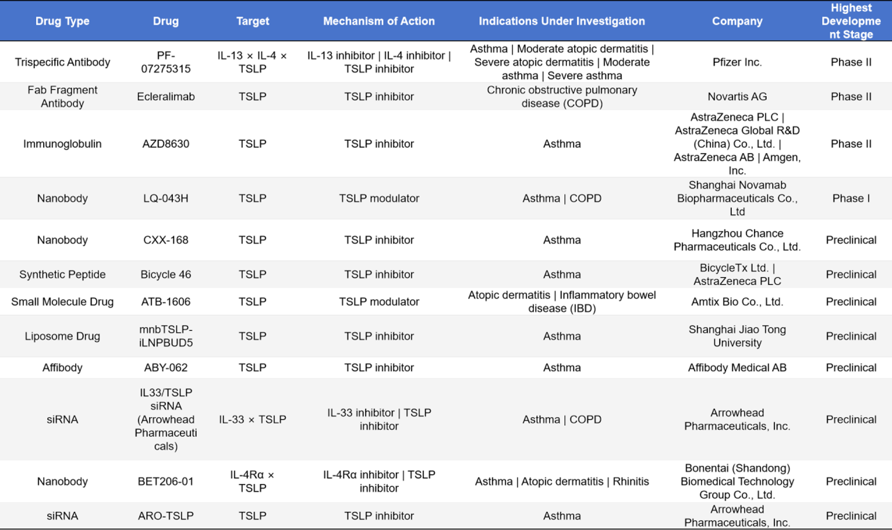 Currently, drug development targeting TSLP is primarily focused on monoclonal antibodies, but is gradually expanding into novel formats such as inhaled formulations, bispecific antibodies, and fusion proteins.