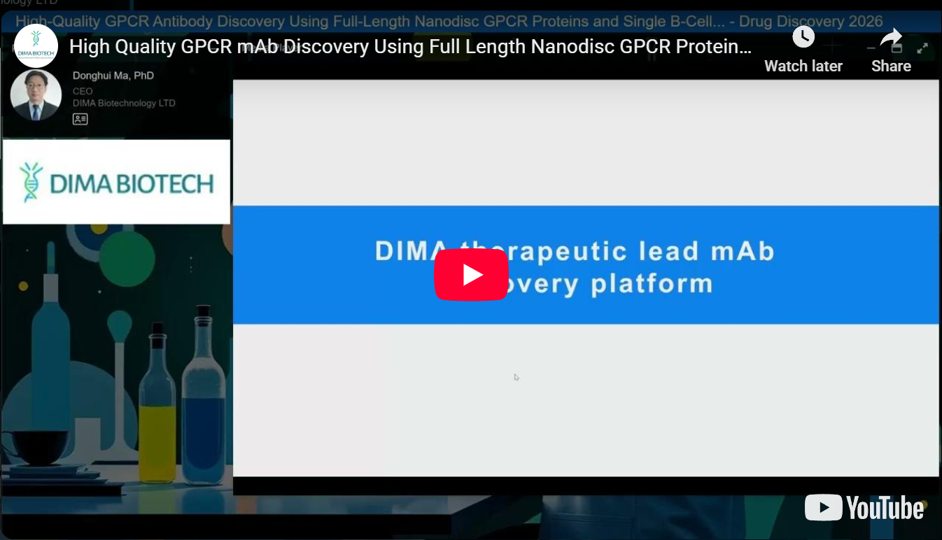 At DIMA Biotechnology, we have developed an integrated platform that combines proprietary full-length Nanodisc GPCR proteins with single B-cell cloning technology to enable efficient discovery of high-quality monoclonal antibodies. Our Nanodisc-based antigens maintain native structure and biological activity, significantly improving antibody specificity, affinity, and functional relevance.