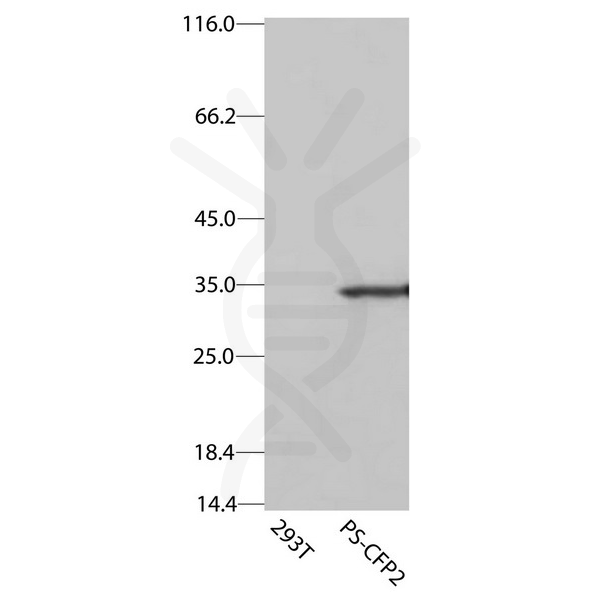 Figure 2.HEK293T cells were transfected with the pCMV6-ENTRY control (Left lane) or pCMV6-ENTRY PS-CFP2 (Right lane) cDNA for 48 hrs and lysed. Equivalent amounts of cell lysates (5 ug per lane) were separated by SDS-PAGE and immunoblotted with anti-AcGFP1/PS-CFP2 (DME900018, 1:2000).
