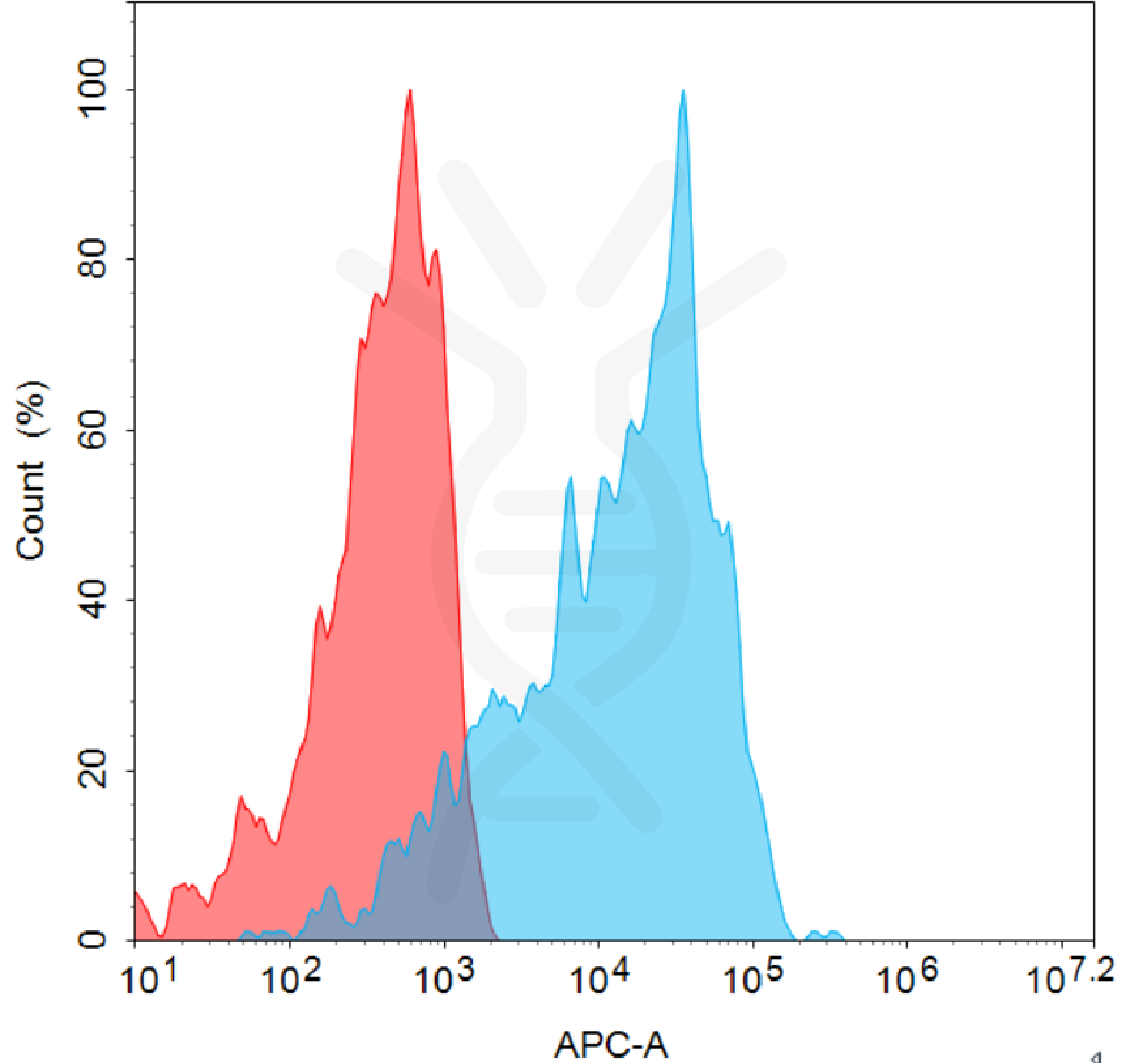 Figure 1. Flow cytometry analysis with 1μg/mL Anti-CA12 antibody(1D12) mAb on HEK293 cells transfected with human CA12 (Blue histogram) or HEK293 transfected with irrelevant protein (Red histogram).