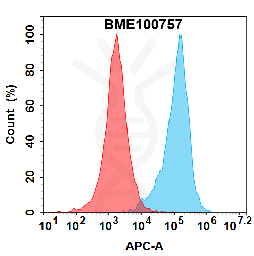 Figure 1. Flow cytometry analysis with 7.5 μg/ml Anti-CLDN1(lixudebart biosimilar) mAb (BME100757) on HEK293 cells transfected with Human CLDN1 protein (Blue histogram) and HEK293 transfected with irrelevant protein (Red histogram) .