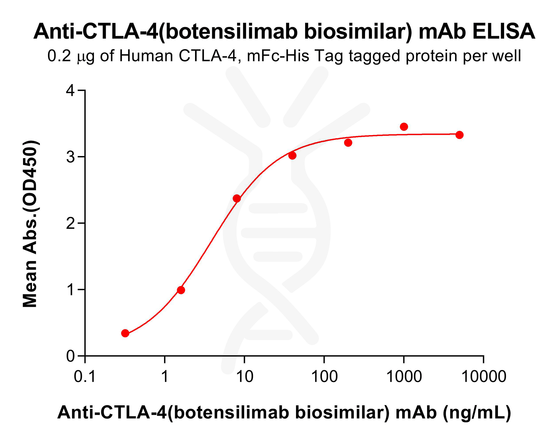 Figure 1. ELISA plate pre-coated by 2 μg/mL (100 μL/well) Human CTLA-4 Protein, mFc-His Tag(PME100017) can bind Anti-CTLA-4(botensilimab biosimilar) mAb (BME100440)in a linear range of 1.6-8.0 ng/mL.