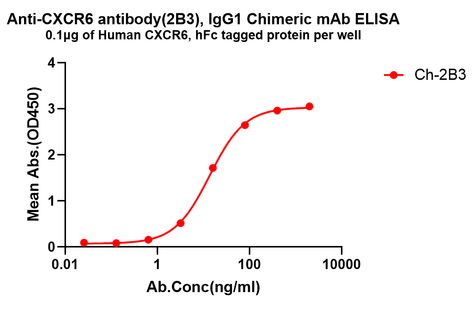 Figure 1. ELISA plate pre-coated by 1 μg/ml (100 μl/well) Human CXCR6 Protein, hFc Tag can bind IgG1 Chimeric anti-CXCR6 monoclonal antibody(clone: 2B3) in a linear range of 3.2-80 ng/ml.