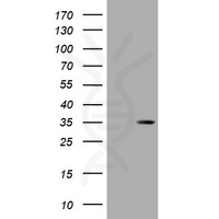 Figure 1.HEK293T cells were transfected with the pCMV6-ENTRY control (Left lane) or pCMV6-ENTRY DsRed-Monomer (Right lane) cDNA for 48 hrs and lysed. Equivalent amounts of cell lysates (5 ug per lane) were separated by SDS-PAGE and immunoblotted with anti-DsRed-Monomer.