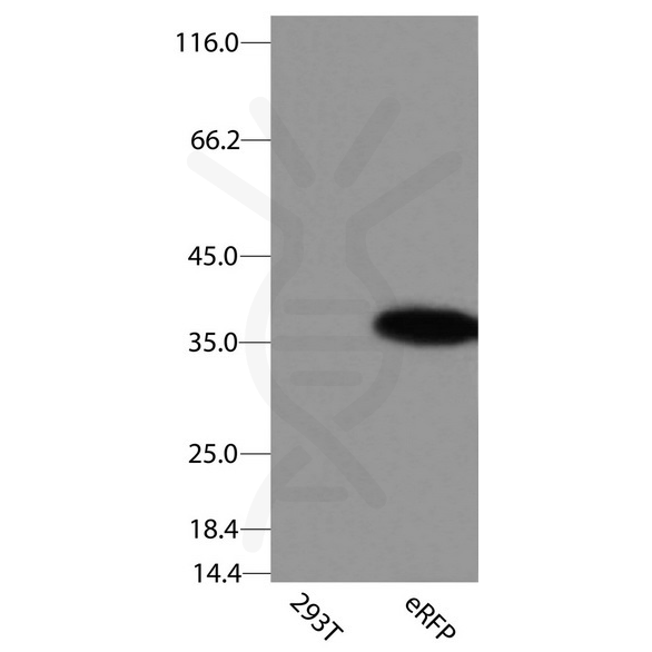 Figure 1.HEK293T cells were transfected with the pCMV6-ENTRY control (Left lane) or pCMV6-ENTRY eRFP (Right lane) cDNA for 48 hrs and lysed. Equivalent amounts of cell lysates (5 ug per lane) were separated by SDS-PAGE and immunoblotted with anti-eRFP (DME900025, 1:2000).