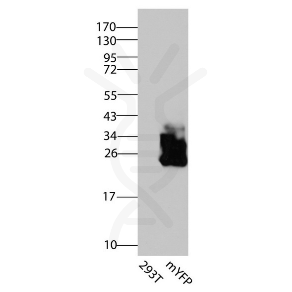 Figure 3.HEK293T cells were transfected with the pCMV6-ENTRY control (Left lane) or pCMV6-ENTRY mYFP (Right lane) cDNA for 48 hrs and lysed. Equivalent amounts of cell lysates (5 ug per lane) were separated by SDS-PAGE and immunoblotted with anti-mGFP/mCFP/mYFP/KillerRed (DME900030, 1:500).