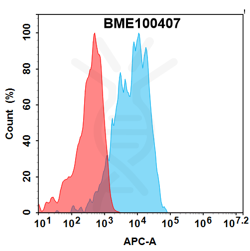 Figure 1. Flow cytometry analysis with 0.5 μg/ml Anti-SIGLEC15(aldastotug biosimilar) mAb (BME100407) on HEK293 cells transfected with human SIGLEC15 (Blue histogram) or HEK293 transfected with irrelevant protein (Red histogram).
