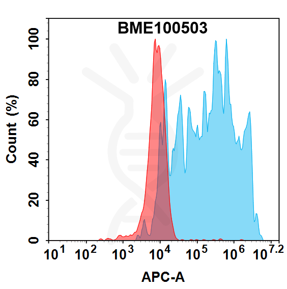 Figure 1. Flow cytometry analysis with 0.5 μg/mL Anti-SNCA(exidavnemab biosimilar) mAb (BME100503) on HEK293 cells transfected with SNCA protein (Blue histogram) or HEK293 transfected with irrelevant protein (Red histogram).