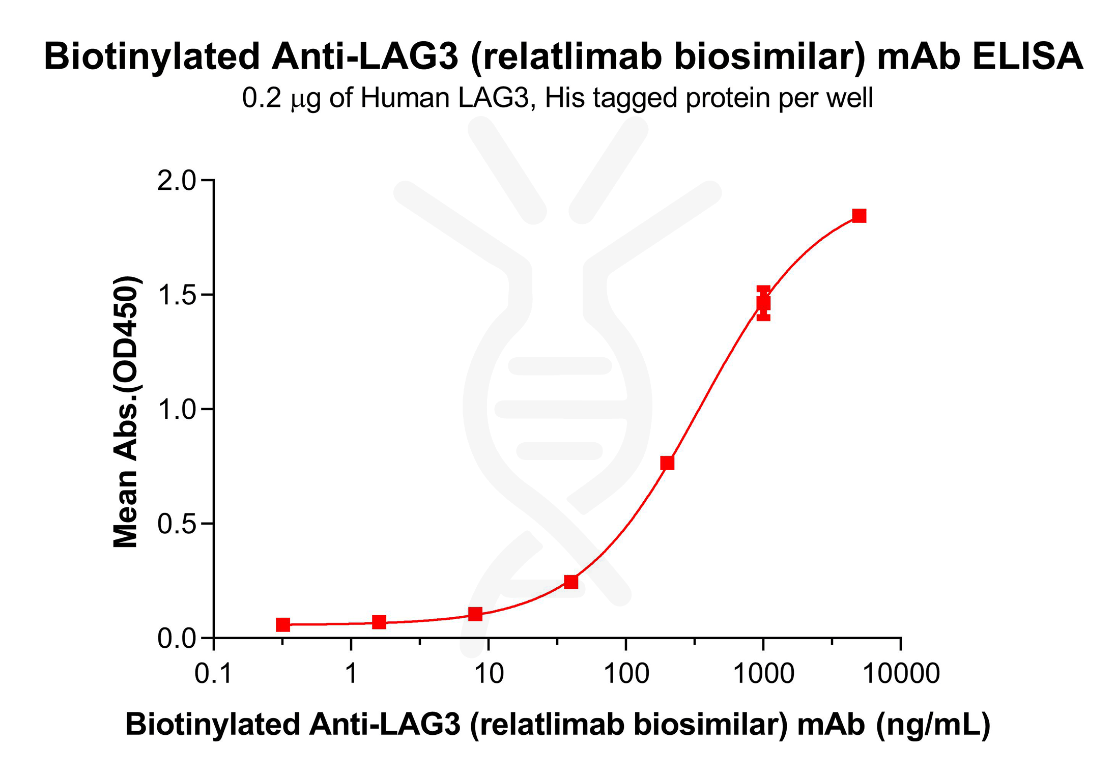 Figure 1. ELISA plate pre-coated by 2 μg/mL (100 μL/well) Human LAG3 Protein, His Tag (PME100512) can bind Biotinylated Anti-LAG3 (relatlimab biosimilar) mAb (BME100062B) in a linear range of 200-1000 ng/mL.
