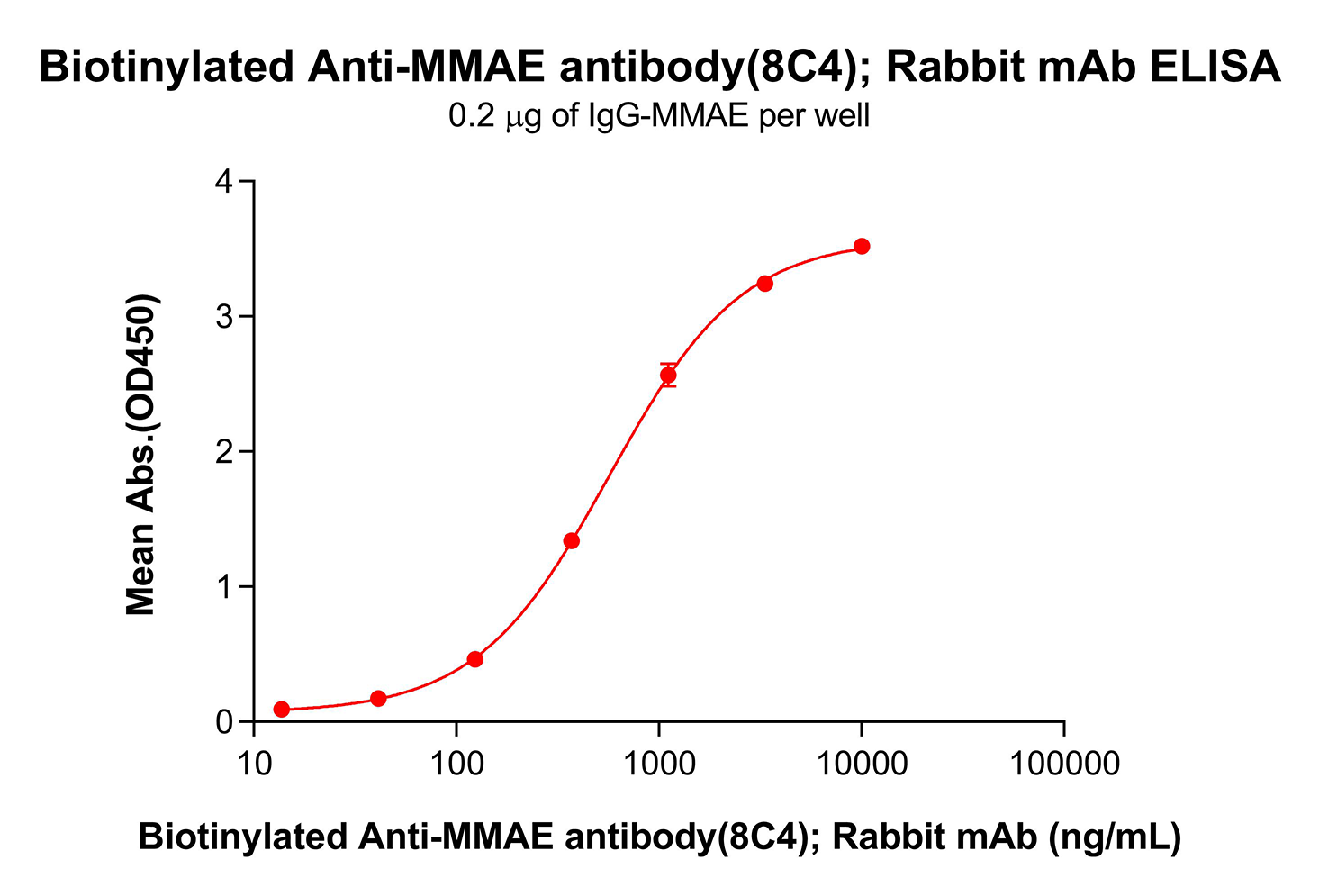 Figure 1. ELISA plate pre-coated by 2 μg/mL (100 μL/well) IgG-MMAE can bind Biotinylated Anti-MMAE antibody(8C4); Rabbit mAb (DME101004B) in a linear range of 370–1111 ng/mL. In order to specifically detect DME101004B, HRP Conjugated-Streptavidin was used as detection antibody.