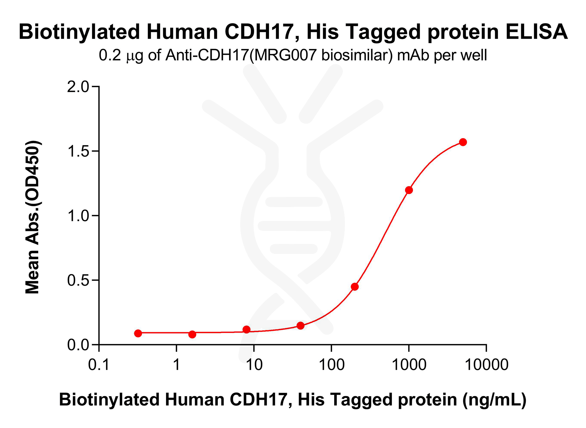 Figure 2. ELISA plate pre-coated by 2 μg/mL (100 μL/well) Anti-CDH17(MRG007 biosimilar) mAb (BME100289) can bind Biotinylated Human CDH17 Protein, His Tag (PME100801B) in a linear range of 200-1000ng/mL.