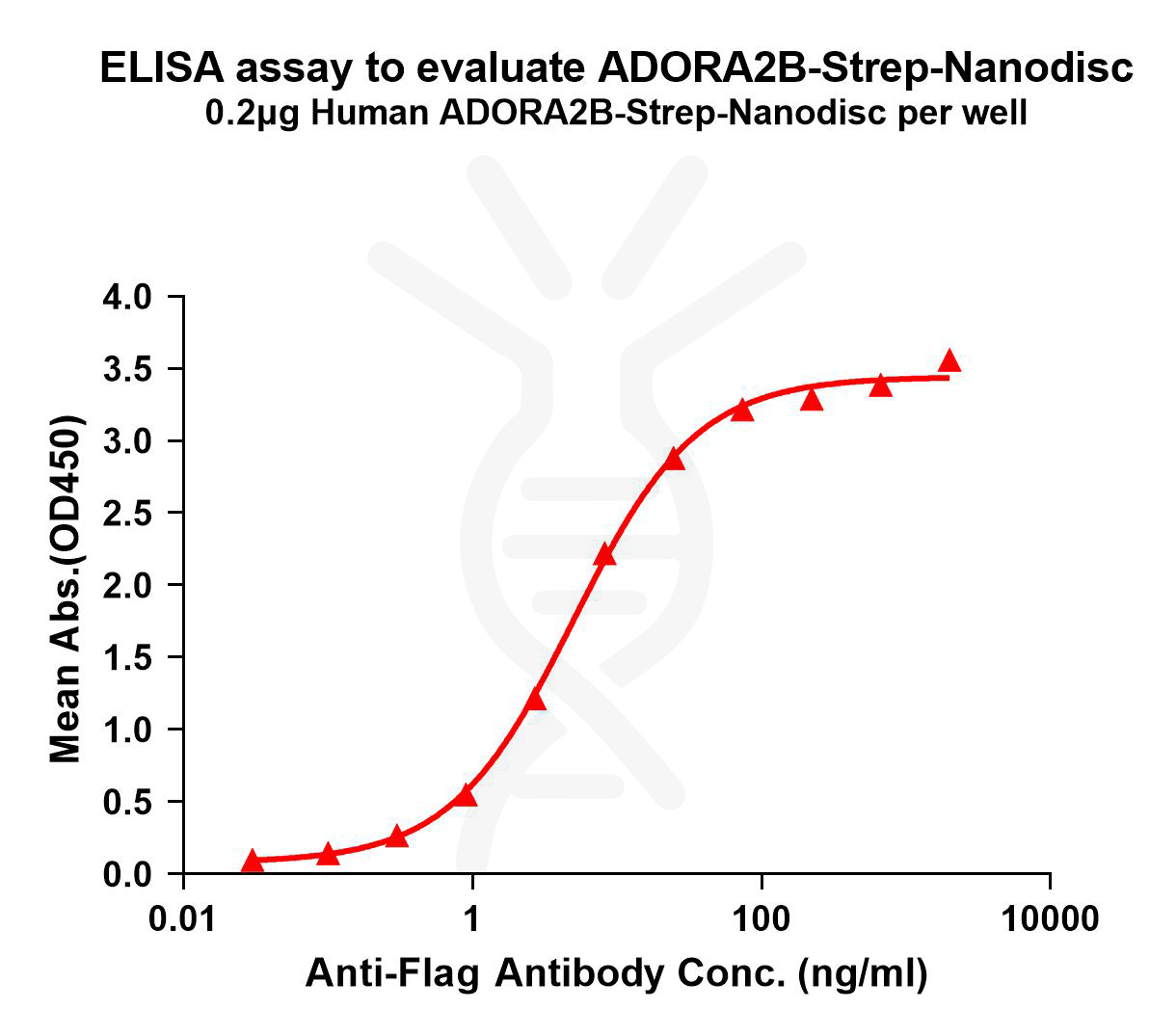 Figure 1. Elisa plates were pre-coated with C-Flag&Strep Tag ADORA2B-Strep-Nanodisc (0.2μg/per well). Serial diluted anti-Flag monoclonal antibody solutions were added, washed, and incubated with secondary antibody before Elisa reading. From above data, the EC50 for anti-Flag monoclonal antibody binding with ADORA2B-Strep-nanodisc is 5.026ng/ml.