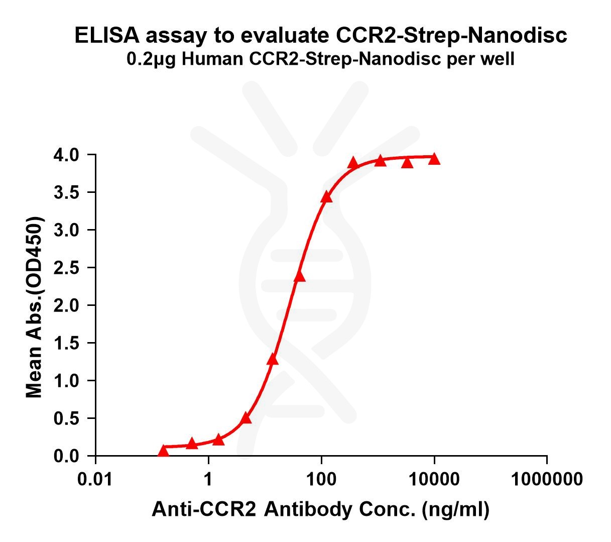 Figure 1. Elisa plates were pre-coated with C-Flag&Strep Tag CCR2-Strep-Nanodisc (0.2μg/per well). Serial diluted anti-CCR2 monoclonal antibody (DMC100447) solutions were added, washed, and incubated with secondary antibody before Elisa reading. From above data, the EC50 for anti-CCR2 monoclonal antibody binding with CCR2-Strep-Nanodisc is 28.36ng/ml.