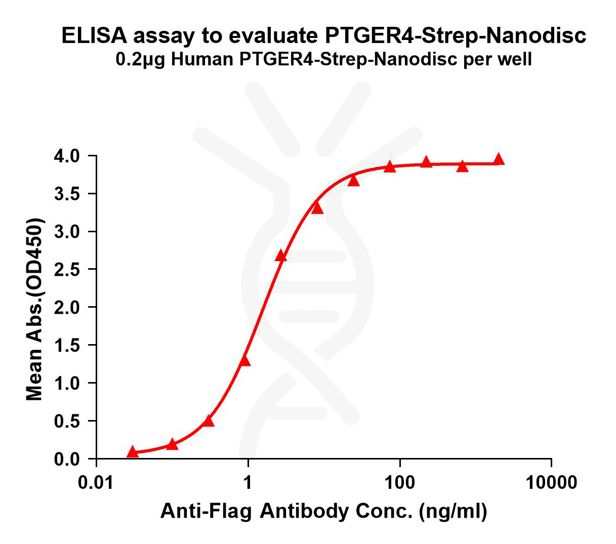 Figure 1. Elisa plates were pre-coated with C-Flag&Strep Tag PTGER4-Strep-Nanodisc (0.2μg/per well). Serial diluted anti-Flag monoclonal antibody solutions were added, washed, and incubated with secondary antibody before Elisa reading. From above data, the EC50 for anti-Flag monoclonal antibody binding with PTGER4-Strep-nanodisc is 1.566ng/ml.