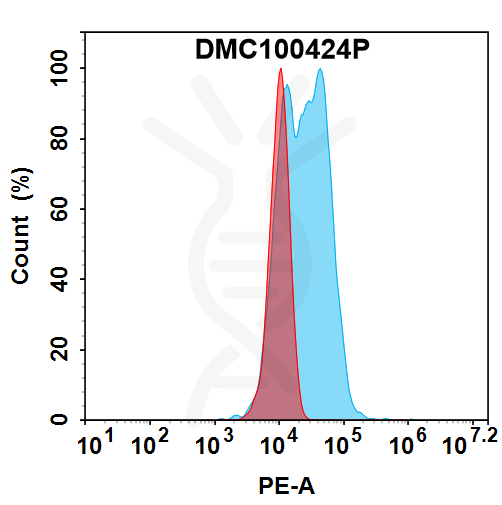 Figure 1. Flow cytometry analysis with 100 μl/test (1:200) PE-conjugated Anti-EREG antibody(DMC424), IgG1 Chimeric mAb (DMC100424P) on HEK293 cells transfected with Human EREG protein (Blue histogram) or HEK293 transfected with irrelevant protein (Red histogram).