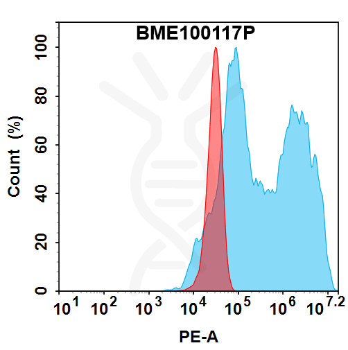 Figure 1. Flow cytometry analysis with 100 μl/test (1:400) PE-conjugated PE-conjugated Anti-IFNAR1(anifrolumab biosimilar) mAb (BME100117P) on HEK293 cells transfected with Human IFNAR1 protein (Blue histogram) or HEK293 transfected with irrelevant protein (Red histogram).