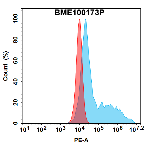 Figure 1. Flow cytometry analysis with 100 μl/test (1:400) PE-conjugated Anti-TIM3(sabatolimab biosimilar) mAb (BME100173P) on HEK293 cells transfected with Human TIM3 protein (Blue histogram) or HEK293 transfected with irrelevant protein (Red histogram).